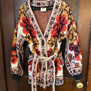 Vibrant jacquard Tapestry cardigan by FARM Rio with a matching belt. Features a mix of red, orange, and black colors. Very gently worn (once).