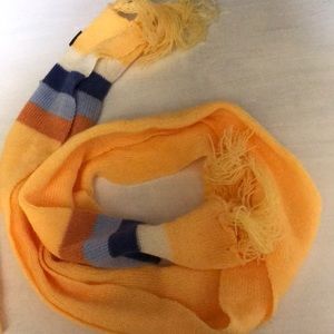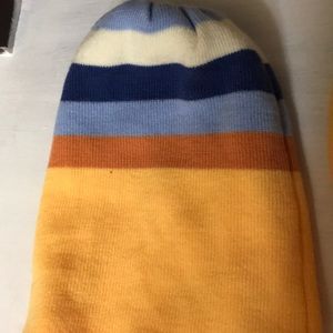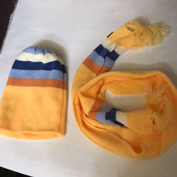 A beanie and scarf for winter. APART OF MY WINTER WARDROBE EVENT! Orange, light blue, dark blue, and dark orange theme colors!