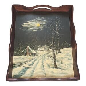 Winter Snow Home Scene By Lee on Wooden Tea Tray 19" x 15"