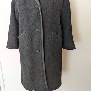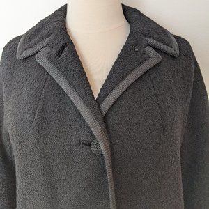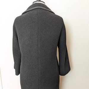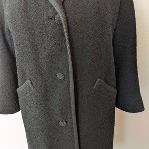 This coat is made of thick and heavy wool bucle knit. It is fully lined with satin and has two front slash pockets. I removed the shoulder pads, but pads could easily be added back if desired. SUPER warm and it withstood winters in Upstate New York. Bracelet length sleeves and the length hits around the knee depending on your height. In fair to good vintage condition.