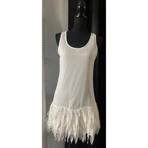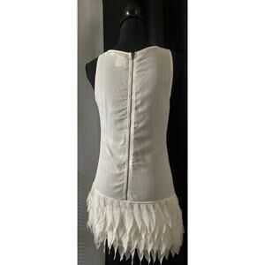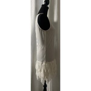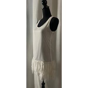 New with tags, winter white, round neck, sleeveless slip dress with lining, 10" faux feather layering at bottom of dress, and zipper closure.