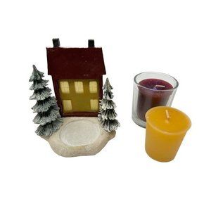 The House Votive Candle Holder is Resin and has a glass votive candle holder along with 2 votive candles. There is a small spot of discoloration on the base of the back of the house but not very noticeable since it is in the back - please see picture.