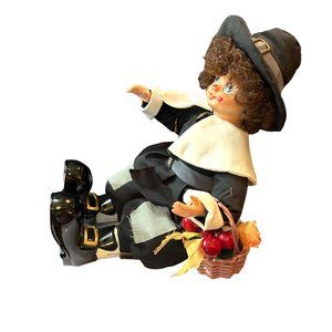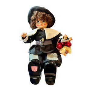 This 12-inch Vintage Winter Wonderland Porcelain Calendar Clown Doll from Brinns is dressed as a pilgrim in black, grey, and white, holding a basket of apples and leaves, perfect for holiday decoration.