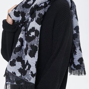 Scarf is leopard print with a gray thick beanie hat.