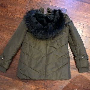 Green/Brown winter coat, gold detail with black faux fur hood. Worn only a few times on a trip. Great condition