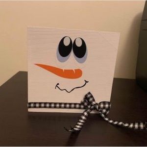 Snowman is painted all white with vinyl embellishments this block measures approximately 5”x5”.