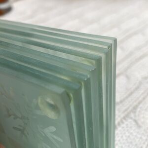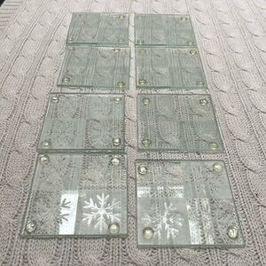 Winter glass coasters. Set of 8. Frosted etched snowflakes each with silicone bumpers for easier mobility. Missing bumper on one coaster see pics for condition