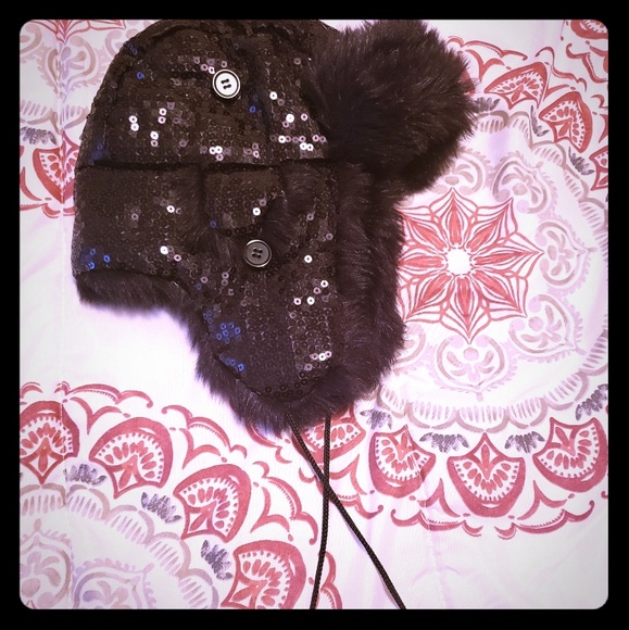 Black sequence fuzzy hat that is SO warm! Never worn, but no tags. Flaps over the ears.