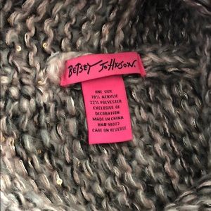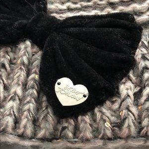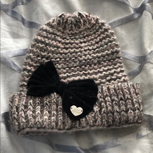 Betsey Johnson winter hat with fun accent velvet bow. Has tones of pink, gray, back, and gold. New without tags, never worn before. Comes from a smoke free home.