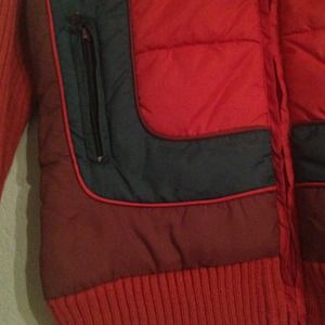 Terra cota red jacket with green and brown pocket areas, never worn. :) willing to negotiate and bundle