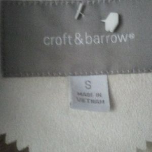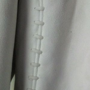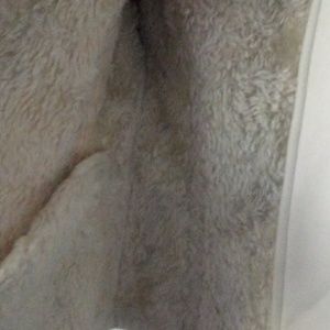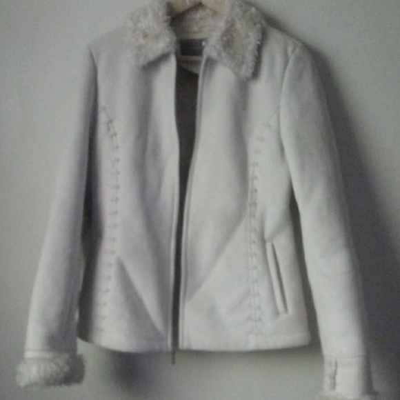 Off white sued jacket with thick layered material inside and on collar and arm cuffs. Zips up