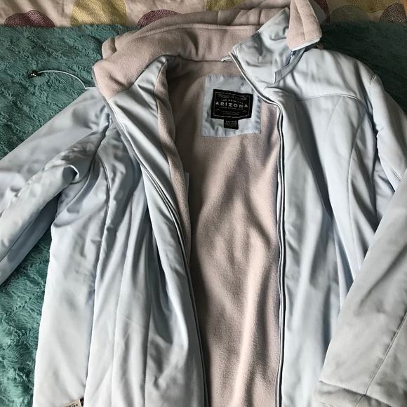 Beautiful light blue winter jacket from Arizona. Multiple pockets on the inside with removable hood. The zipper needs replacing.