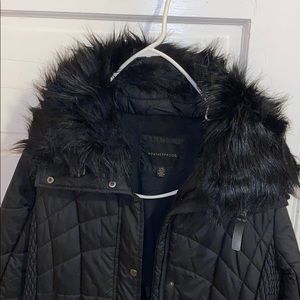 Black winter jacket. No hood but fur around collar. Fur is removable. Covers butt. Worn for 1 winter season