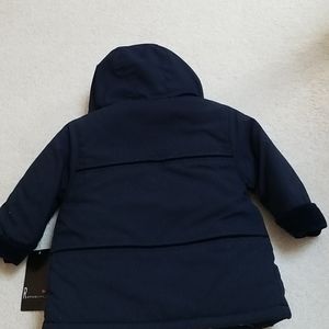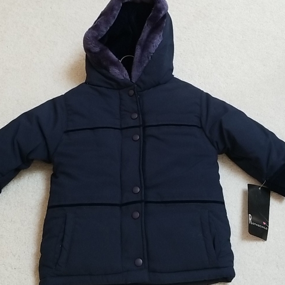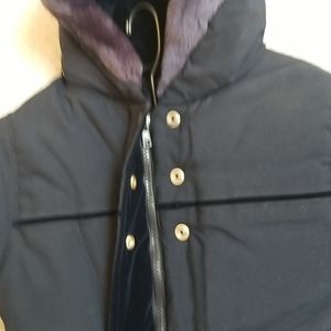 Quilted girls jacket with zipper and snaps. Faux velvet cuffs on sleeves. Hood is lined with same velvet and fur trim.