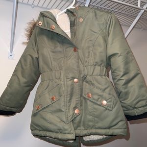 Army green toddler winter jacket with sherpa lining and rose gold metal details
