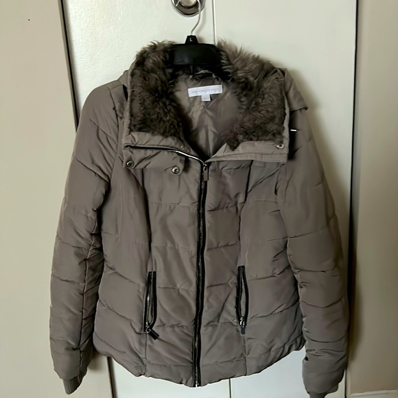 Cute puffer jacket with silver zippers. Also can retract hood.