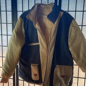 Jacket with many pockets, heavily insulated down cluster pockets inside and out. Hoodie missing sleeves offers wrist cotton section for more warmth. Great for colder climates.