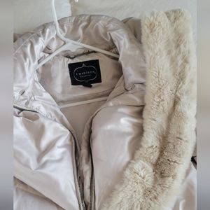 Real fur. Very Warm the zipper sometimes doesn't work properly