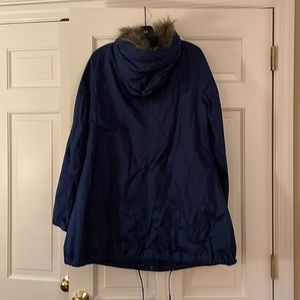 Garnet Hill navy jacket. Size-10. Matching fleece liner. Detachable liner and faux fur lined hood. Full zipper with snaps over zipper. Draw string on inside of coat to cinch waistline if needed. Draw string at bottom of coat on outside to cinch tighter.