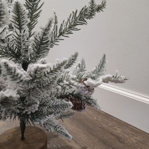 Winter/holiday tree decor. Fake snow, pine cones, and a painted wood base.