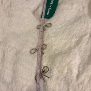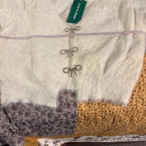 Angora type winter white cropped cardigan. Extremely soft. Has 3 removable “bow” pins … adds a little bling! Very pretty for the holiday parties or whenever you want to make a statement! Never wore… too small for me. It’s a SHEIN large so it runs smaller. My loss your gain!! See photos for measurements..