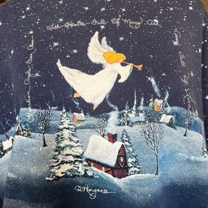 Vintage - in good condition. Winter/Christmas scene on navy blue crewneck sweatshirt. White lined collar - the rest of the sweatshirt is single lined in the navy blue material. 360 degrees of winter scenery - angel image is the front, the cabin/house scene is seen on the sleeves and the back of the sweatshirt.