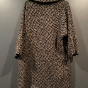 Three buttonwinter jacket. Bottom of the jacket flares open a bit. Lays right above the knees. Coat sleeves and three quarter.