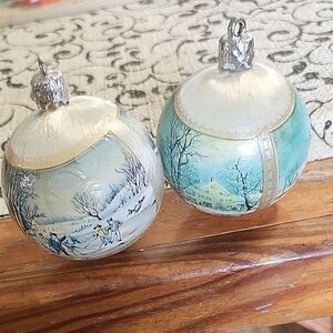 Add a touch of winter charm to your holiday decor with these beautifully crafted ornaments. Featuring serene winter scenes in blue and white, these ornaments are perfect for creating a festive atmosphere. The scenes may be Currier and Ives but nt not sure.