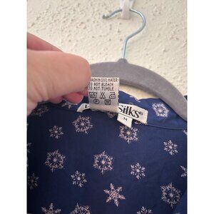 WinterSilks Womens Snowflake Pattern Button-Up Shirt M 100% Silk Navy Blue