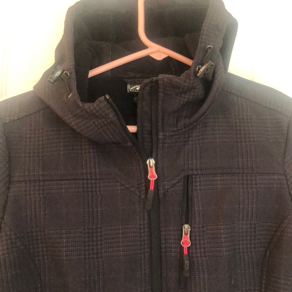 Super cute!! Slightly fitted CB jacket. Wear as is soft fleece lining or as a shell for skiing. Subtle plaid black/grey with pink accents on zipper. Water resistant and warm.