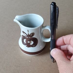 This ceramic pitcher features a charming hand-painted apple motif in deep brown on a white background. Its classic form, complete with a pouring spout and handle, is enhanced by a decorative brown band at the base. The piece exudes a vintage, rustic aesthetic, perfect for art enthusiasts and collectors.vintage 70's