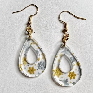 Beautiful earrings. Winter / Christmas style with snowflakes and angels on clear acrylic. Open teardrop shape with gold toned hardware. Laser cut on my glowforge and hand assembled by me