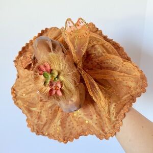 • Design: Red braided pigtail hair, green eyes, wearing a flower crown with glitter, metallic beads, baubles, silk floral accents, and flowing costume in gold, orange, and brown tones
