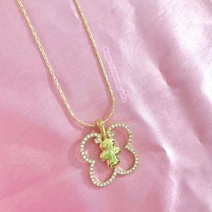 This gorgeous Winx Club Flora inspired fairy dust bottle pendant is approx 17.5 inches with extender on gold plated chain and sturdy iron base. Pendant features dozens of white cubic zirconia crystals lining the butterfly silhouette dust bottle shape.