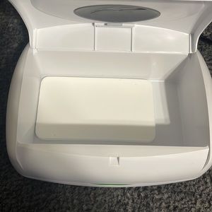 Wipe warmer bought from Walmart. Used for 3 days. Includes moisture holder and plug in. It does not clasp correctly. Shown in pictures. I bought it like this and didn’t realize until after I had thrown away box and could not find receipt . When I used it, I put a couple of diapers on top to hold it closed. When something is sitting on top of it it works properly. Holds moisture and warmth. No other flaw. I have seem to fix the clasp, but not for sure when running