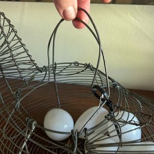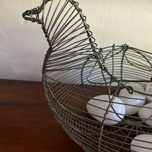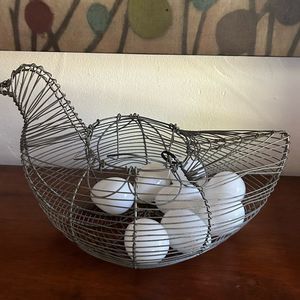 Add a rustic touch to your home with this charming wire chicken basket. Featuring a sleek gray wire design, it comes with decorative blown glass white eggs. Perfect for adding a farmhouse accent to any room.