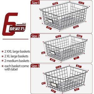 🧿6 BASKETS, 3 SIZES - The 6 metal wire basket come with 3 different sizes - 2 XXlarge, 2 Xlarge and 2 Medium. XXlarge - 15.6"(L) x 11.2"(W) x 6"(H). Xlarge - 15.2"(L) x 10.6"(W) x 5.6"(H). Medium - 11.2"(L) x 8.7"(W) x 4.7"(H).You can use different sizes for different purposes