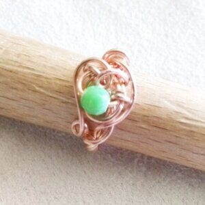 Unique and one-of-a-kind ring - created with loads of copper jewelry wire in an organic swirls + curls design, with a single bright, spring green Fire Agate Bead worked into the flow. Sturdy band that will hold its shape - there's nothing fragile about this ring, even though it may look like a girly, sugarspun confection. Perfect for spring and Easter - the bright green Agate beads just add that touch of upbeat color that puts you in a good mood! Size 4 - for a petite hand, a pinkie or a perfectly sturdy, inexpensive starter ring for a little girl!