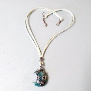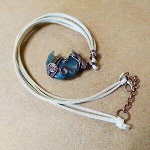 Loads of curled wire wrapping covers this Crescent India Agate Moon, but the darker brown Aluminum Wire makes it less girly and a bit more rugged/rustic in appearance rather than ultra feminine. Replacing the usual copper or bronze chains with a cream, double strung Faux suede cord, adds to the rustic appeal.