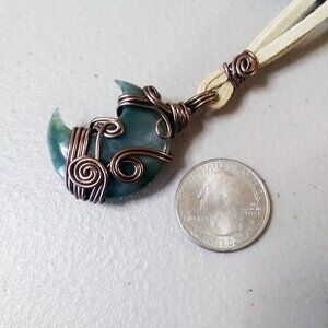 Wire Wrapped India Agate Moon Necklace | Dark Green Crescent Moon w. Faux Suede
