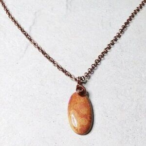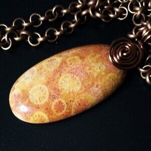 Wire Wrapped!!! Mango + Tangerine Hues! Chrysanthemum Fossil Pendant + 20" Chain