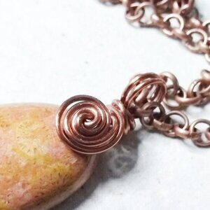 Lovely, feminine colors - with a bold copper wire wrapped bail - this pendant includes a 20" Copper Rolo Chain, turning it into a ready2wear necklace for you. If you need it longer, pls ask me prior to purchasing. I'll gladly add an extender chain to this for you at no additional cost, when you pay my full asking price!