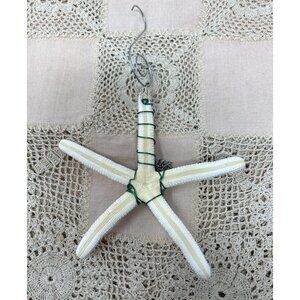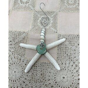 This Christmas Ornament from Sharon @ Coastal Creations is a handcrafted wire wrapped in green, pencil starfish with green sea glass and a palm tree charm. Cream and green in color with green wire it measures 5 inches in height and width.