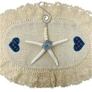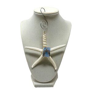 This Christmas Ornament from Sharon @ Coastal Creations is a handcrafted wire wrapped in gold, pencil starfish with blue sea glass and an angel wings charm. Cream and blue in color with gold wire it measures 5 inches in height and width.