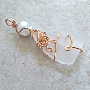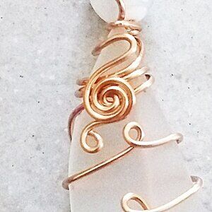 I created this unique pendant with a tumbled shard from a huge Mexican Crystal Glass Vase [that I unfortunately broke :o( ] and a white/opaque Fire Agate Bead. I wire wrapped it with copper jewelry wire in a feminine loopz + swirlz design that will not become undone, unless you purposely take a pair of pliers or a hammer to it!!!