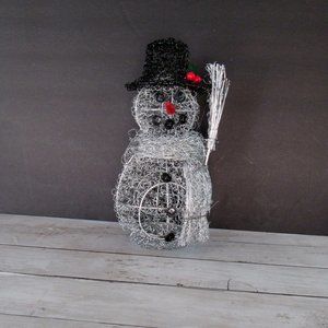 Pretty snowman is 15" high and has a tray on the bottom for a tealight or small candle. He is made of thin silver metal, woven and curled wires. Hat is a black coated wire. He has button trim and a cute "carrot" nose! Small trapdoor in back opens for candle. Perfect addition to your Christmas or winter holiday decor! Candle not included.