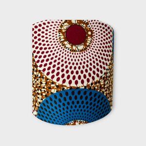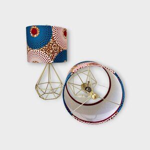 Gold colored wire Lamp upholstered with fun printed Ankara fabric in circle motif.