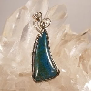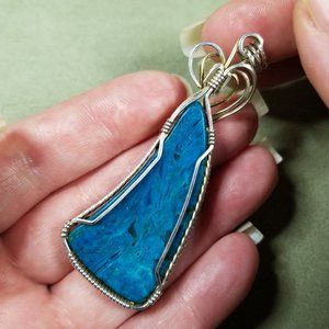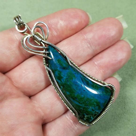 Beautiful Silver wire wrap surrounds a stunning, rich blue/green Chrysocolla cab to create this wonderful, one of a kind statement Pendant. It reminds me of a blue angel. The Chrysocolla cab was made from old stock Morenci mine material. The stone itself measures 45mm x 23mm and the pendant has a round bale large enough to accommodate a chain or cord up to 5mm wide.