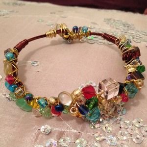 Wire wrapped bangle with multicolored crystals, glass, and seed beads.