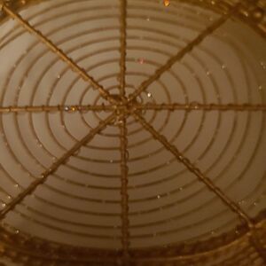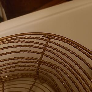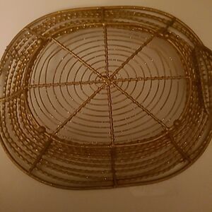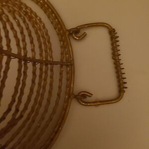 Pre-owned in good condition. Goldtone glittery wire basket that is wrapped around and secured with interwoven wiires.The also has two handles which are wrapped in wire. The bottom length is approximately 8 inches and the top is approximately 14 inches. The bottom of the basket has feet.